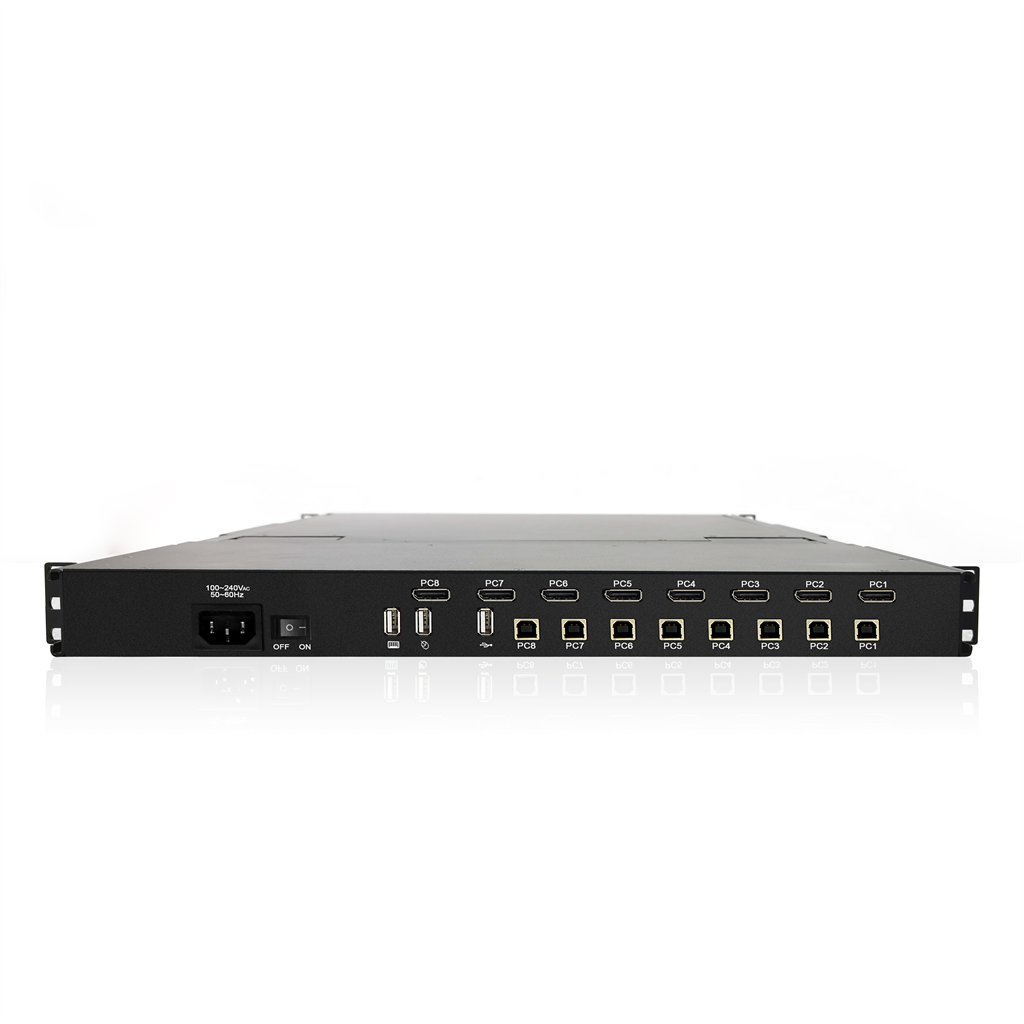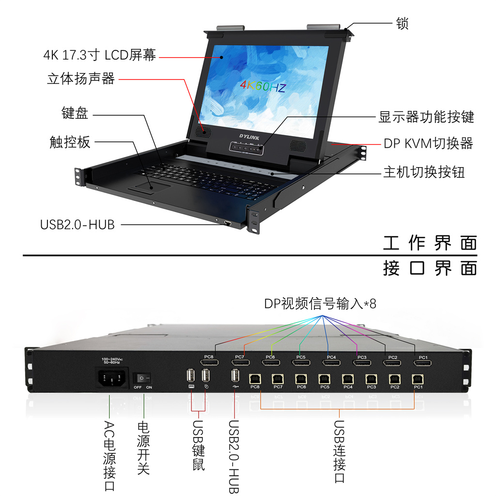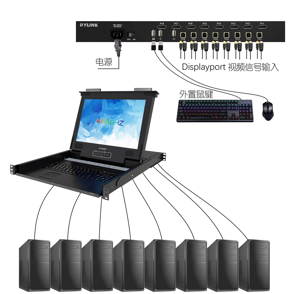DY-SW1708DP-LCD Displayport 控制端為一款具備音視頻功能的4K KVM控制設(shè)備, DY-SW1708DP整合 8路KVM 控制端與 17 寸液晶屏于 1U 高度結(jié)構(gòu)內(nèi)從而管理 8 臺(tái)電腦服務(wù)器Displayport 視頻輸入接口,可支持超高清數(shù)字視頻(4K@60Hz)顯示分辨率最高可達(dá) 3840 x 2160,并兼容 2560x1600, 2560x1440,1920 x 1200, 1920 x 1080等多種解析度,用戶可將抽拉式控制端與兼容的DYLINK KVM多電腦切換器或音視頻延長器搭配使用,單軌道設(shè)計(jì)允許LCD顯示器、鍵盤和觸控屏獨(dú)立進(jìn)行操作。該控制端提供8路DP 4K高清視頻信號(hào)。允許將高分辨率顯示器連接控制端端口,或?qū)⒓嫒軩P的切換器連接電腦端端口。 DY-SW1708DP前端面板額外具備一組USB鼠標(biāo)連接端口;后方面板的外接式控制端(鍵盤、鼠標(biāo))。 |