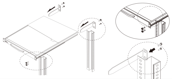 液晶KVM智能控制平臺系列符合標準19英寸機柜的安裝要求,由后向前安裝,先將后掛耳裝在機柜后面,鎖緊后掛耳螺絲,后將KVM控制平臺由機柜前面沿掛耳導槽 插入,鎖緊前掛耳螺絲。根據(jù)掛耳的可調節(jié)長度,可安裝在深度為600mm~1000mm的機柜內。