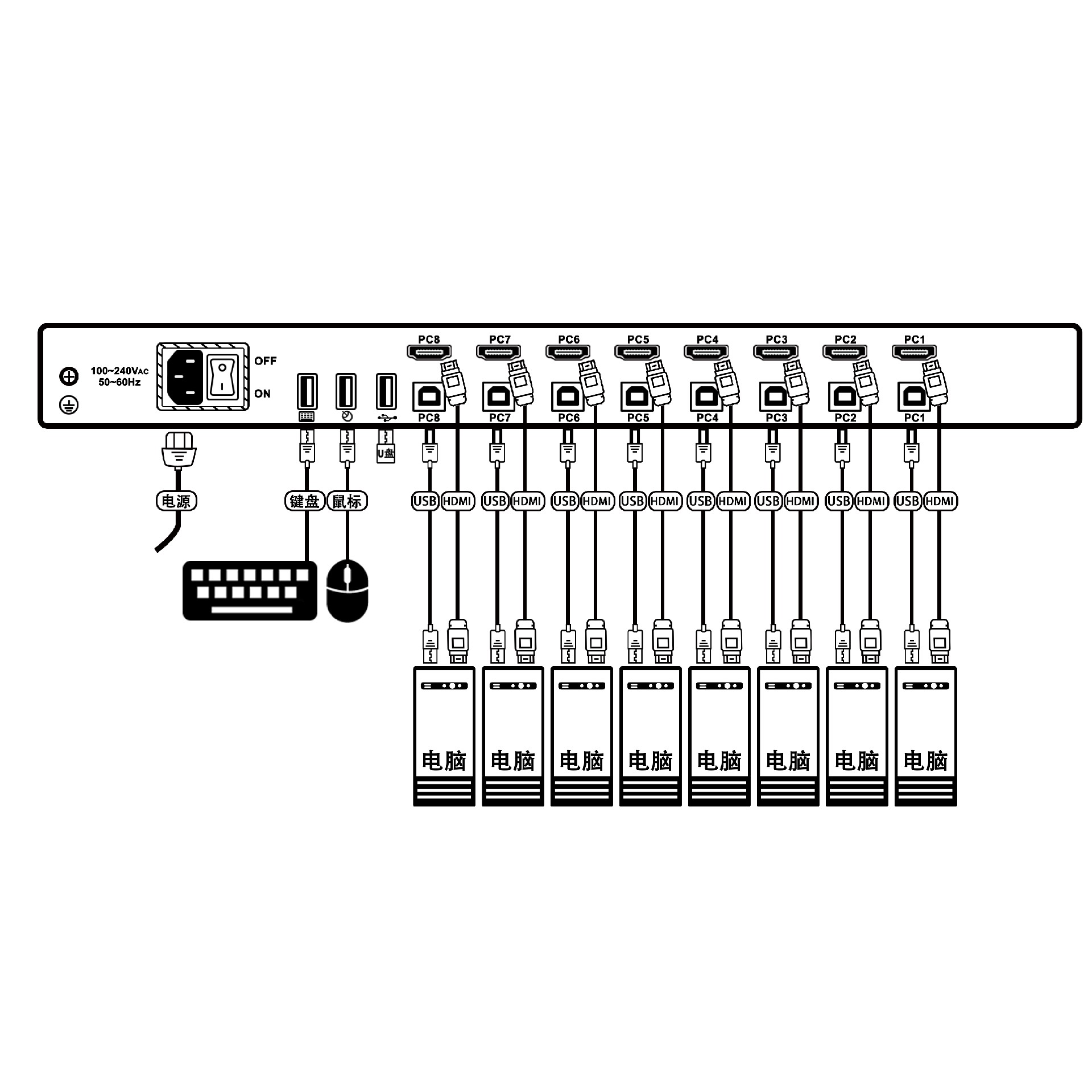 1、安裝好KVM后,接入電源,再把電腦的HDMI和USB一一接上