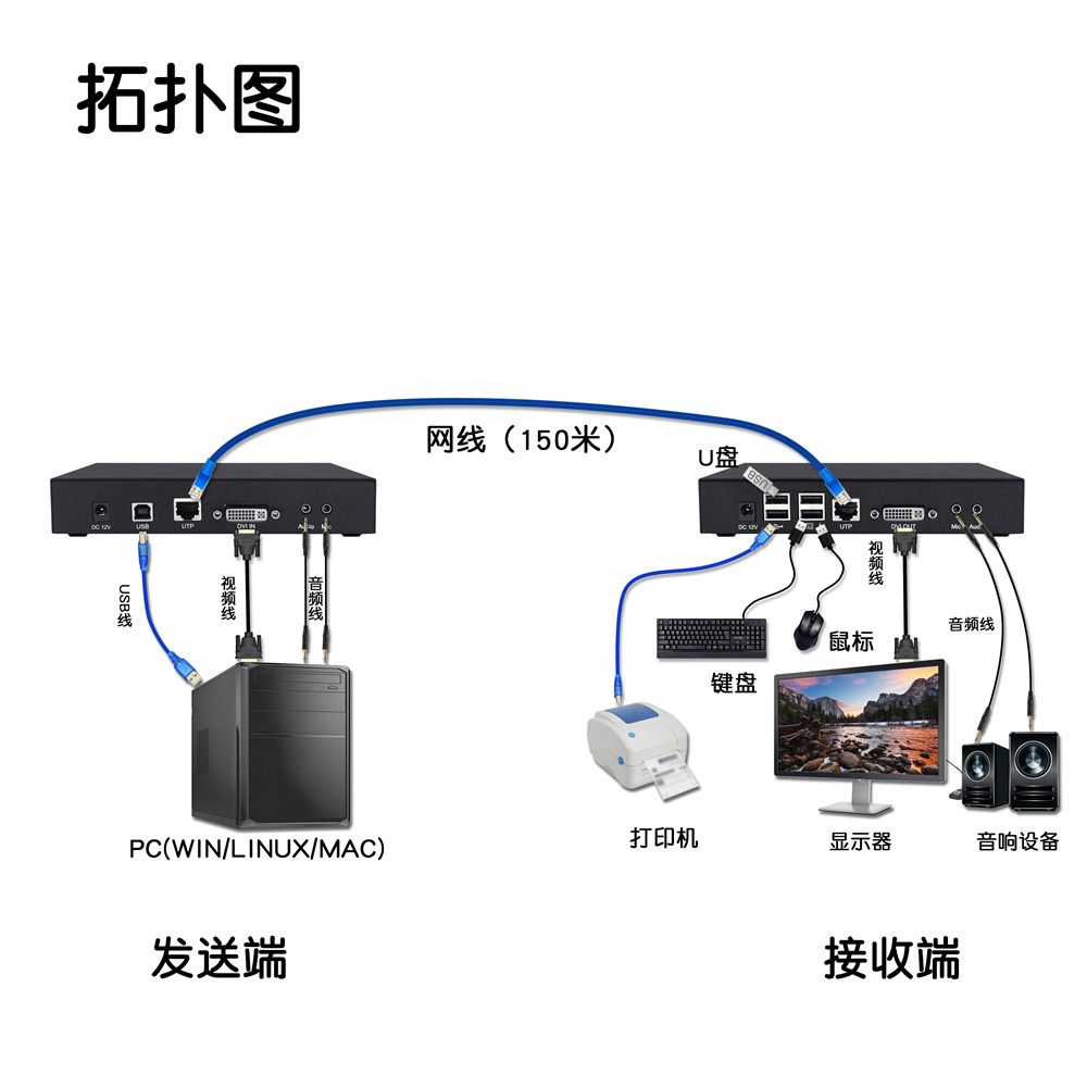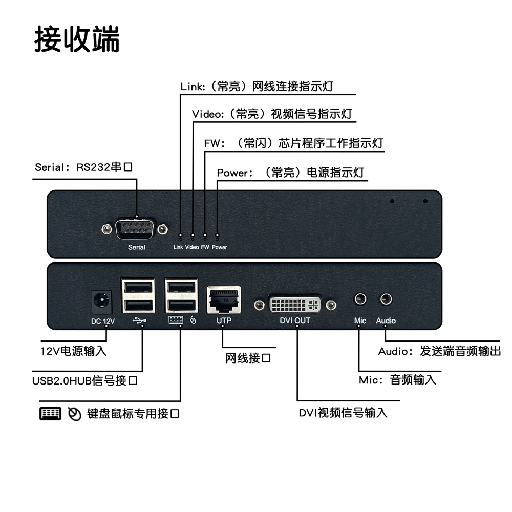 2、接收端連接DVI顯示器、音頻麥克風設備、USB鍵盤鼠標及USB設備;