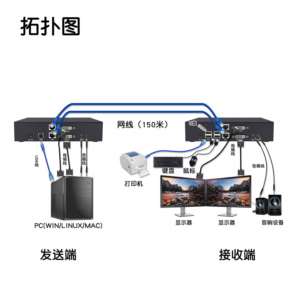 2、接收端連接DVI顯示器、音頻麥克風(fēng)設(shè)備、USB鍵盤鼠標(biāo)及USB設(shè)備;