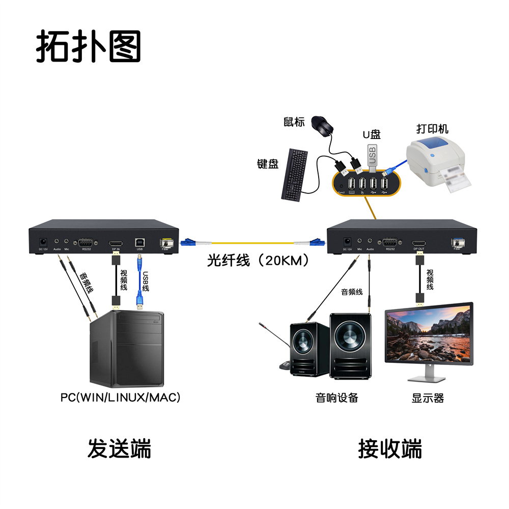 2.采用千兆數(shù)字編碼技術(shù),把設(shè)備的本地發(fā)送端連接電腦主機的VGA視頻信號和USB控制信號等,通過光纖跳線連接(單模可傳輸20公里,多模傳輸300-500米)至延長器的接收端 用戶可以在接收端使用操作電腦。