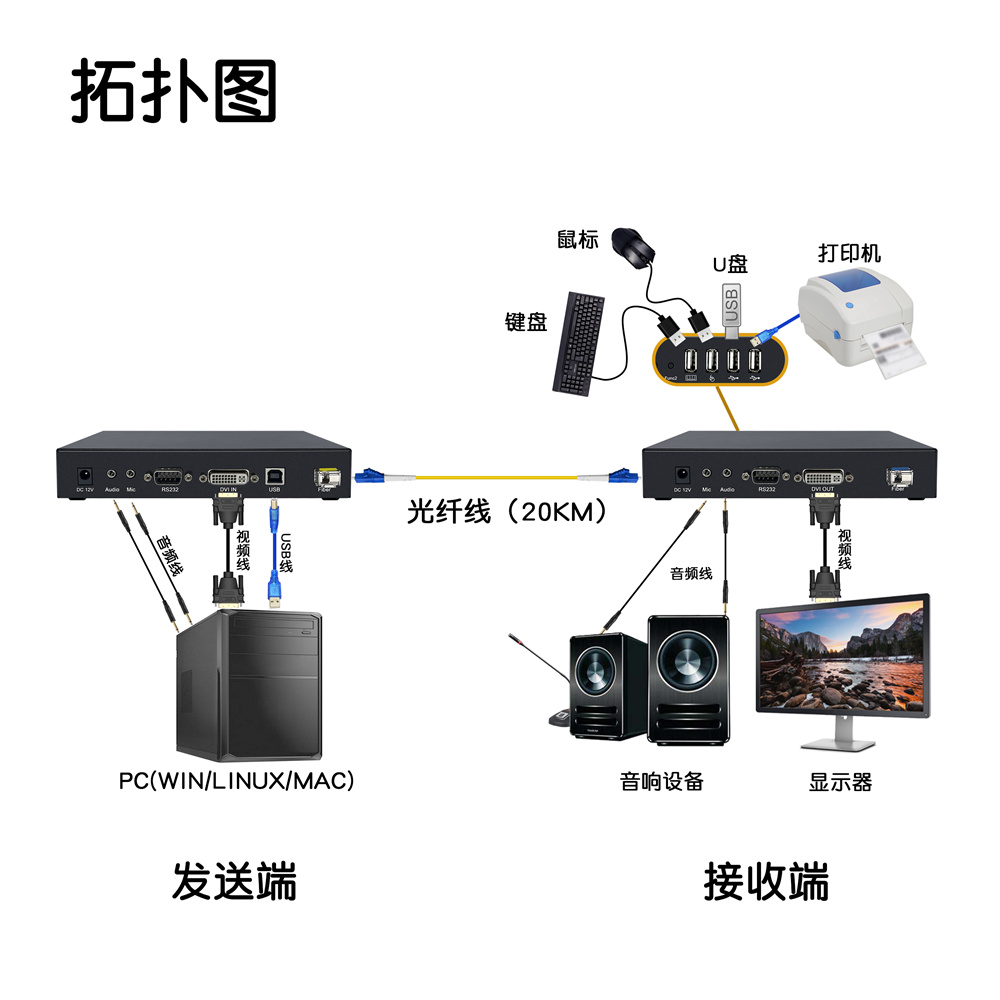 2.采用千兆數(shù)字編碼技術(shù),把設(shè)備的本地發(fā)送端連接電腦主機的VGA視頻信號和USB控制信號等,通過光纖跳線連接(單模可傳輸20公里,多模傳輸300-500米)至延長器的接收端 用戶可以在接收端使用操作電腦。