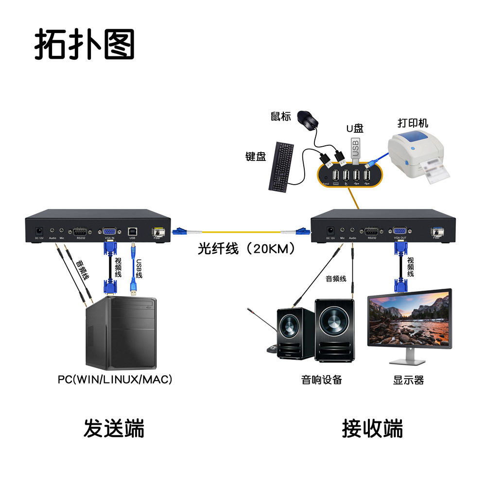 2.采用千兆數(shù)字編碼技術(shù),把設(shè)備的本地發(fā)送端連接電腦主機(jī)的VGA視頻信號(hào)和USB控制信號(hào)等,通過光纖跳線連接(單模可傳輸20公里,多模傳輸300-500米)至延長器的接收端 用戶可以在接收端使用操作電腦。