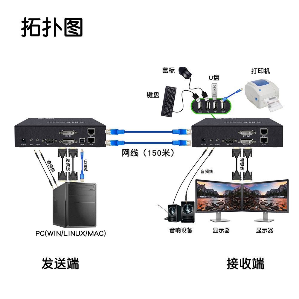 2.采用千兆數(shù)字編碼技術(shù),把設(shè)備的本地發(fā)送端連接電腦主機(jī)的視頻信號(hào)和控制信號(hào)等,通過網(wǎng)線連接(可傳輸150米,穩(wěn)定4K30hz)至延長(zhǎng)器的接收端 用戶可以在接收端使用操作電腦。