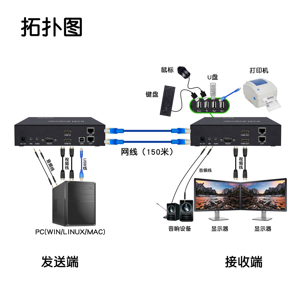 3.接收端連接顯示器、音頻設(shè)備、USB鍵盤鼠標(biāo)及USB設(shè)備;