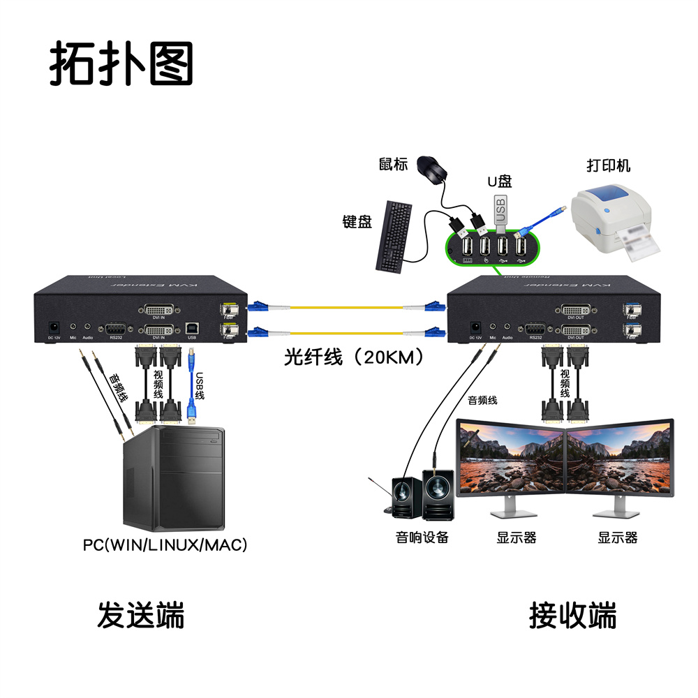 2.采用千兆數(shù)字編碼技術(shù),把設(shè)備的本地發(fā)送端連接電腦主機(jī)的視頻信號(hào)和控制信號(hào)等,通過光纖跳線連接(單模可傳輸20公里,多模傳輸300-500米)至延長(zhǎng)器的接收端 用戶可以在接收端使用操作電腦。