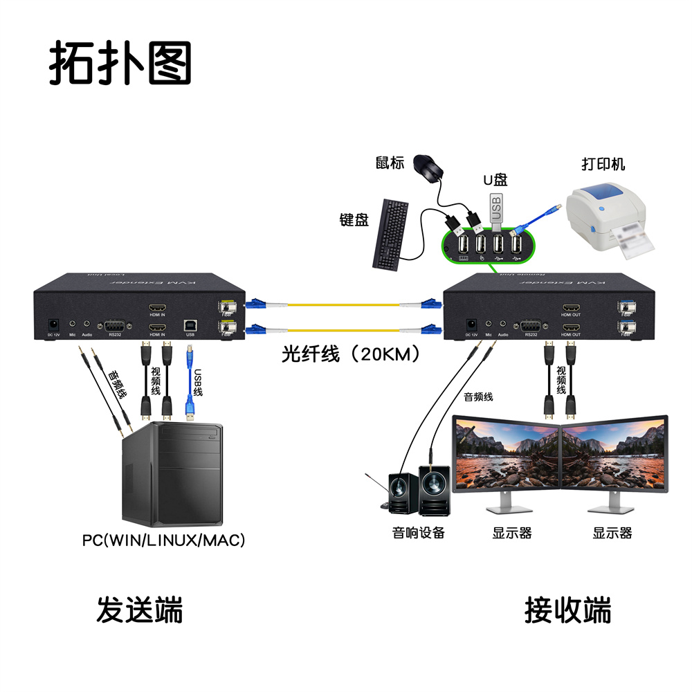 2.采用千兆數(shù)字編碼技術,把設備的本地發(fā)送端連接電腦主機的視頻信號和控制信號等,通過光纖跳線連接(單模可傳輸20公里,多模傳輸300-500米)至延長器的接收端 用戶可以在接收端使用操作電腦。